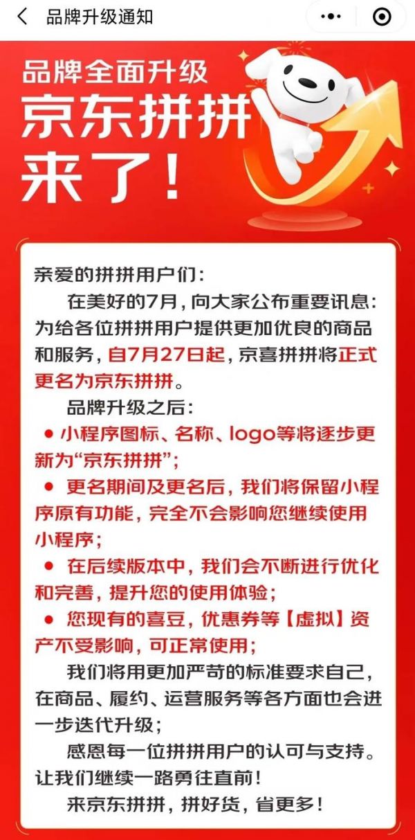 具体来说,品牌升级之后,京喜拼拼小程序图标、名称、logo等将逐步更新为“京东拼拼”,小程序原有功能将被保留。