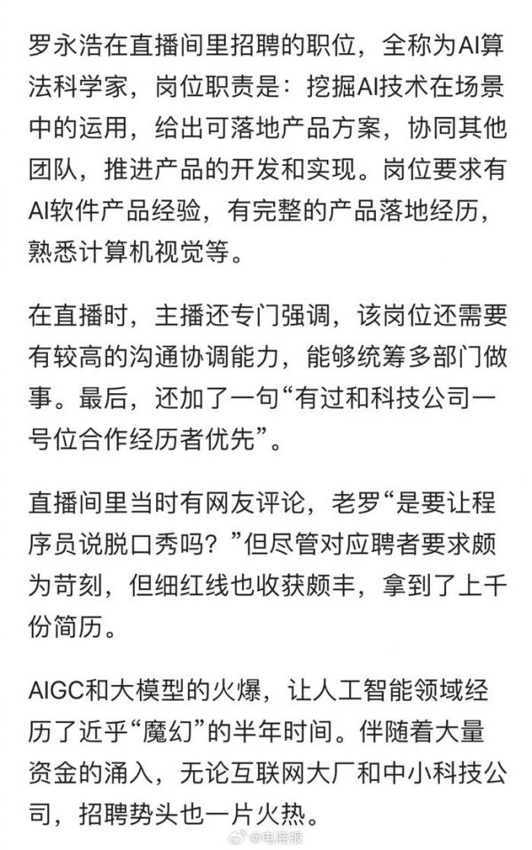 #上千名算法工程师涌入罗永浩直播间# 罗永浩直播间在线招算法科学家,一夜之间超千份简历竞争。没想到AI算法科学家,也有在直播间里“卖爆”的一天。