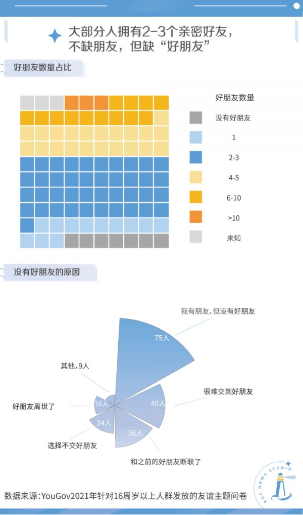 日益疏远的旧友唤起了我们对友谊“终结”的感怀,而结交“新朋友”的坎坷则体现了友谊衰退的另一个维度:新友谊的数量与质量变化。英国调查公司YouGov2021年的数据显示,在数量上,四成受访者的好友人数在2~3人,拥有10位以上好友的情况仅占3%;在质量上,半数调查对象认为自己当前的交际圈中缺乏亲密友谊,对“交朋友”感到困难的人则占比27%。
