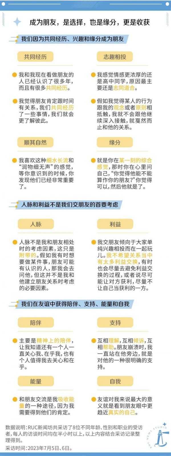 在充满不确定性的生活里,一种自我宣称的趋势容易招致另一种反对的声音,作为人类共同经验的“友谊”也同样如此。我们抵达他者的能力衰退了吗?友谊衰退指向时代症候,还是个体的生命历程?关系中的你与我,如何理解友情的易变与有限?这一次,RUC新闻坊倾听了8位朋友的友谊故事,试图在二元的判断之外寻找联结的其他可能性。