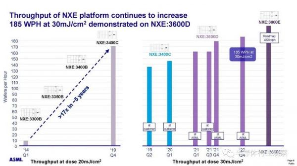 从 2014 年第一季度到 2019 年第四季度,系统吞吐量增加了 >17 倍!NXE:3400C 在客户现场以 30mJ/cm2 剂量实现了约 140 片/小时 (wph),NXE:3600D 在客户现场以 30mJ/cm2 剂量实现了略高于 160 wph 的产能,在 ASML 实现了 185 wph 的产能。NXE:3800E 的目标是 >220 wph!参见图 2。