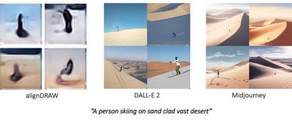 alignDRAW, DALL-E 2, 和Midjourney 文本转图像的不同效果。