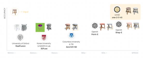 但另外一方面,一些团队正在尝试突破现有的基于优化的生成范式,通过单次前向预测的技术路线来生成3D模型,这大大提高了3D生成速度和准确度。这些方法包括Point-E和Shap-E(分别于2022年和2023年由OpenAI发布)和One-2-3-45(2023年由加州大学圣地亚哥分校发布)。特别值得注意的是,最近一个月发布的One-2-3-45能够在仅45秒的时间内从2D图像生成高质量和具备一致性的3D网格!