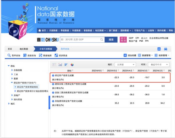 时代财经从国家统计局数据中心查询到,2023年2月,江西省固定资产投资完成额累计增长3%;3月份则降为-19.7%;4月份为-20.3%;5月份为-22.3%;6月份数据未公布。