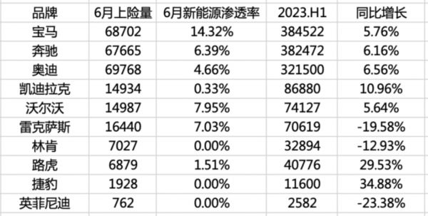 有意思的是,传统豪华阵营的新能源渗透率并不高,即便是最近的6月份,也不到8%,远低于主流市场的总体渗透率,这些车企销售的主力产品,依然是传统燃油车,即便如此,它们的市场份额却并没有减少。