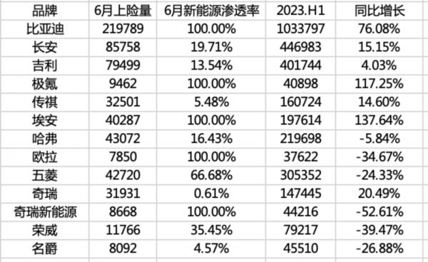 自主阵营变数最大的,当属长城被广汽反超,退到了第五。埃安品牌上半年上险量同比暴增了近1.4倍,正式超过了传祺品牌,并让广汽自主的新能源渗透率,在6月份升到了57.8%。这种总销量和新能源渗透率同时大涨的态势,对广汽非常有利。