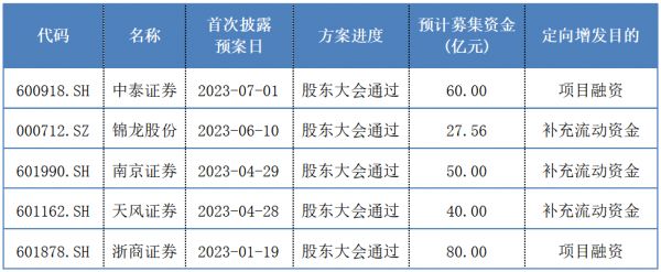 据Wind,按预案公告日,年内,浙商证券、天风证券、南京证券、锦龙股份、中泰证券5家上市券商或母公司披露了定增预案。