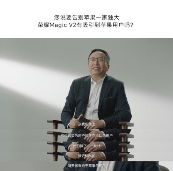 7月28日,荣耀CEO赵明发布视频中表示:“荣耀 Magic V2的购买者中,接近50%的消费者来自于苹果用户。”从目前购机用户看,Magic V2对苹果用户的吸引要远远大于此前的预判。