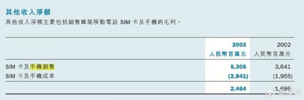 虽然在中国移动的业绩报告中,「销售SIM卡及手机的收入在货品交送买方时确认,由于扣除销货成本后的数额不大,故计入其他收入净额中」。以2003年中国移动的业绩报告为例,和2002年的数据相比,「其他收入净额」仅从16.39亿元提升到了24.64亿元,在千亿人民币级别的花费和收入面前可以说不值一提。