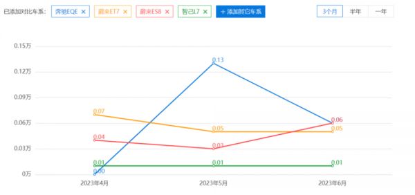 EQE SUV指导价为48.60~63.06万元,算上优惠落地也在45万以上,上市首月销量便达到1533辆。在这个区间,除了理想L系列的增程式车型,还没有月销过千的选手。EQE的竞品则是耳熟能详的蔚来ET7、智己L7等等,销量已然实现反超。