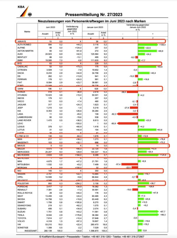 更值得一提的是海外市场。虽然新势力出海口号喊了多年,但在欧洲、北美等发达国家市场,仍旧无法与传统品牌对垒。例如在全球新能源汽车渗透率第二的德国,上半年新能源汽车销量排在前五位的分别是大众、特斯拉、奔驰、奥迪和宝马,国内车企即便强如比亚迪销量也仅有228辆。