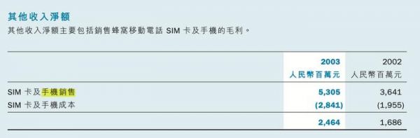 图片来源:中国移动虽然在中国移动的业绩报告中,「销售SIM卡及手机的收入在货品交送买方时确认,由于扣除销货成本后的数额不大,故计入其他收入净额中」。以2003年中国移动的业绩报告为例,和2002年的数据相比,「其他收入净额」仅从16.39亿元提升到了24.64亿元,在千亿人民币级别的花费和收入面前可以说不值一提。