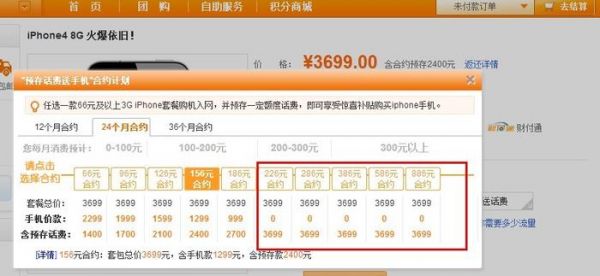 当时iPhone 4的合约售价为3699元人民币,联通给出了从66元到886元的10档24期合约套餐。其中如果用户办理66元24期的套餐,只要预存1400元的话费就可以以2299元的「优惠价」购买iPhone 4。但如果你办了的是月费228元或更贵的套餐,只需要预存3699元话费就可以直接带走手机。