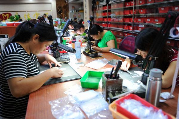 相较于北京柜姐的清闲,广西四线小城梧州的珠宝大厦中,女工们仍在加班加点的忙碌着。低矮的台灯之下,与北京展柜里类似的各色宝石正随意散落在台面,它们正等待被做成精美的首饰,光芒同样闪耀,但价格却低得惊人。