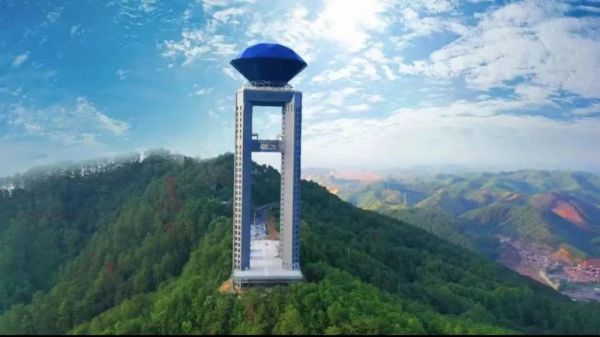 梧州市西江大桥南岸,一座巨型宝石塔屹立在白云山上,基座刻着“世界人工宝石之都”