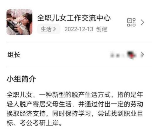 豆瓣“全职儿女工作交流中心”小组,将“全职儿女”定义为年轻人脱产寄居父母生活,并通过付出一定的劳动换取经济支持,同时保持学习,尝试找到职业目标、考公上岸。