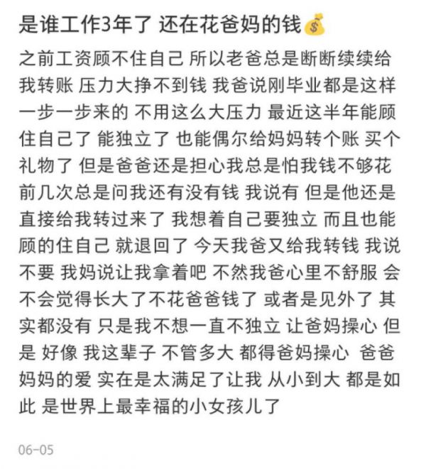 小红书关于毕业后接受父母资助的表达