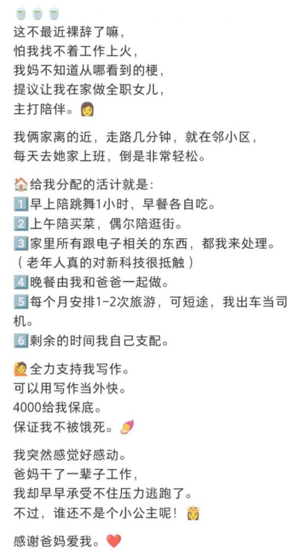 寻找热爱成为唯一的出口,只是长时期置身于规范化生产流程下考试选拔出来的个体,对于自我的认知与探索鲜有自主选择的空间,何以在短时间内触发热爱的按钮?因此,在生存需求并不急迫,家庭尚可为其托底,且愿意给予孩子一定的成长时间之下,全职儿女应运而生。