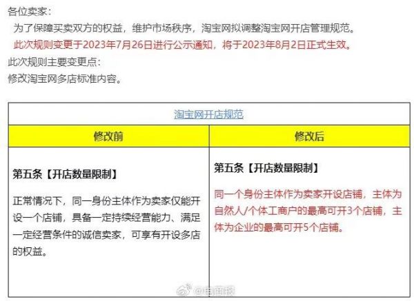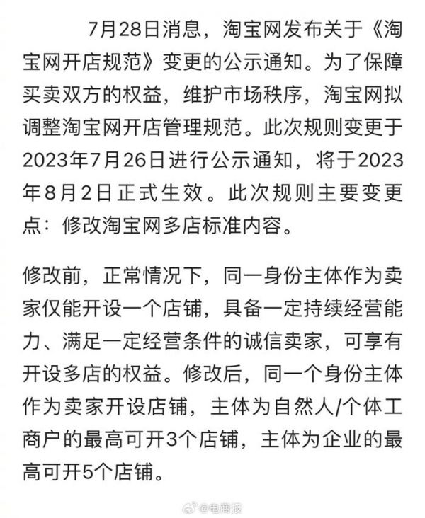 #淘宝同一主体最高可开5个店铺# 淘宝放开限制,向商家出手了!一个公司最多能开设5家淘宝店,个人个体户能开3家!