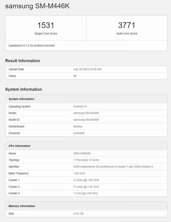 IT之家 7 月 29 日消息,型号为“SM-M446K”的韩版 Galaxy M44 5G 手机近日现身 GeekBench 6.1 跑分库,单核成绩为 1531 分,多核成绩为 3771 分。