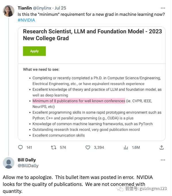 Twitter上名为“Tianlin”的AI研究员po出了英伟达的大语言模型和基础模型研究科学家的招聘启事,在这个启事里,除了近期博士毕业、深度了解大语言模型和深度学习等常规要求以外,还放了一个非常炸裂的要求,直接让各大研究者们开骂——“至少要有8篇顶会(CVPR、IEEE、NeurIPS)论文”。