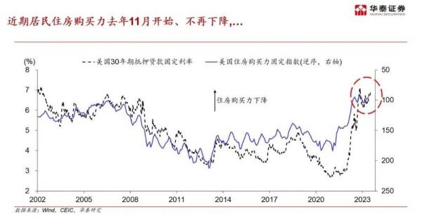 也就是说,虽然短端在加息,长端30年国债利率见顶之后,房贷压力的传导没有再继续。同时今年的名义GDP增长也不差,收入增速、薪资增速都在4%以上,购买能力也不能说回到低利率时代,但是消化了一部分利率上升的影响,因为收入增速还不错,所以又再加上房地产库存,可供销售月数已经从去年11月份的高点是9.7个月跌回6.7个月。30年国债利率见顶的时候购买力不再下降,房地产的库存开始下降,市场的供需在收紧,房价下跌的压力被止住了。