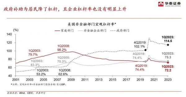 因此,美国经济的韧性一方面是因为通胀的组成有所不同,很多人预期通胀会很快过去,至少市场是这么预期,另一方面是在疫情期间居民端是去杠杆、企业杠杆率下降,宏观杠杆率没有上升。第三是财政和货币政策今年以来都没有紧缩,虽然加息但是货币条件是宽松的,而且财政今年大幅宽松,尤其是补贴制造业。