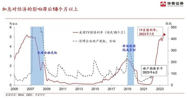 但是加息肯定不是晴空万里,这是彭博的破产指数和一年国债利率的历史关联,基本上18个月以后开始有所显现。美联储开启快加息是去年7月,要观察对经济的影响可能需要明年1月份才能明确,这当中有滞后效应,因此也不必说一定不会衰退,目前来看在较为宽松的财政政策支撑以及通胀下行较快的背景下,至少给了货币政策空间。