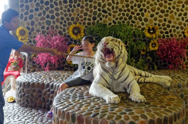 实际上,马戏团的鞭子明晃晃地展现在灯光下,旅游景点的鞭子却藏在看不到的角落。为了让老虎保持温顺,一些旅游景点会在老虎食物中加入大量镇静剂,让老虎昏昏欲睡,任人摆布,更不会攻击游客。工作人员有时还会用棍子戳它们的脸或是直接抽打,以达到合影的效果。