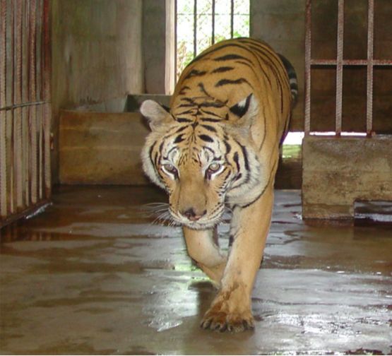 贫瘠的圈养环境对老虎也是一种折磨。野生虎一晚上就可以漫游十几公里,它们的脚垫柔软而富有弹性,悄悄靠近猎物时不会发出任何声音。而在圈养环境下,老虎只能被关在有限的铁笼中,忍受无处不在的饥饿和坚硬的混凝土地面,甚至被拴上短小的铁链。狭小而枯燥的生活环境,往往还会造成严重的刻板行为。