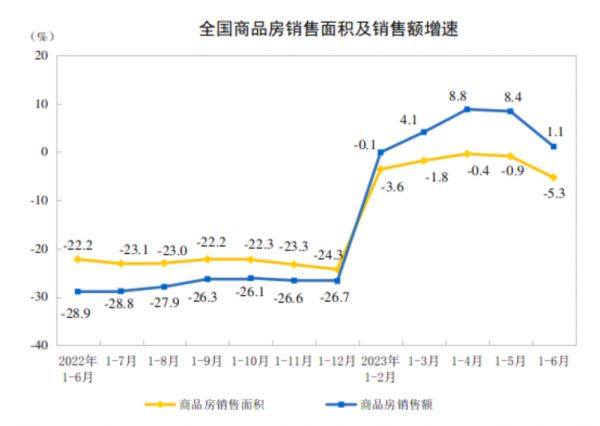 国家统计局7月17日发布的数据显示,今年上半年,全国商品房销售面积59515万平方米,同比下降5.3%,其中住宅销售面积下降2.8%;商品房销售额63092亿元,增长1.1%,增幅较1~5月大幅收窄7.3个百分点,其中住宅销售额增长3.7%。截至6月末,全国商品房待售面积64159万平方米,同比增长17.0%,其中住宅待售面积增长18.0%。