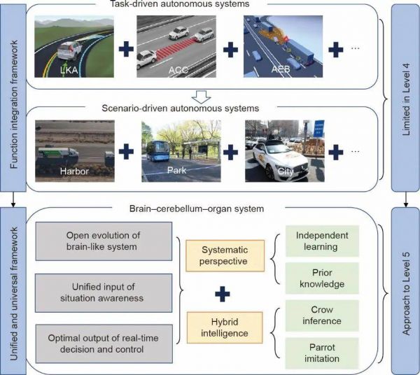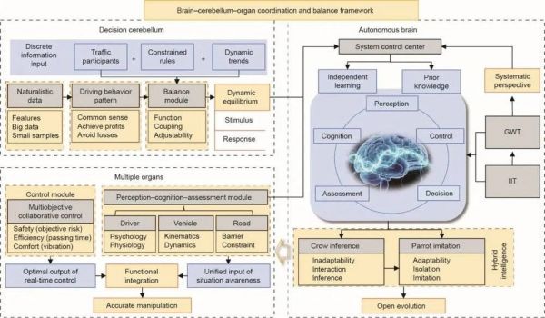 具体而言,文章将系统科学理论作为自动驾驶系统开发的核心思想,将自动驾驶汽车视为具有“自学习、自适应、自超越”能力的智能生命体。基于“大脑-小脑-器官”的协调平衡框架和基于“乌鸦推理+鹦鹉学舌”研究范式的混合模型,为发展高等级自动驾驶汽车提供了新的视角。