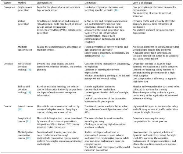 如先前的研究所述,针对目前的感知、决策、控制技术的发展现状,要真正实现L5级自动驾驶离不开各项技术的推动。比如Chen等引入了基于事件的自主驾驶神经形态视觉的新概念,可以帮助高等级自动驾驶汽车获取更准确的视觉感知信息。这对发展更高等级自动驾驶汽车,尤其是L5级自动驾驶汽车至关重要。而高等级自动驾驶所需要的技术条件与目前的发展现状存在一些差距。同时,除了技术和基础设施原因,自动驾驶汽车目前仍然无法达到L5级的更深层次的原因主要有: