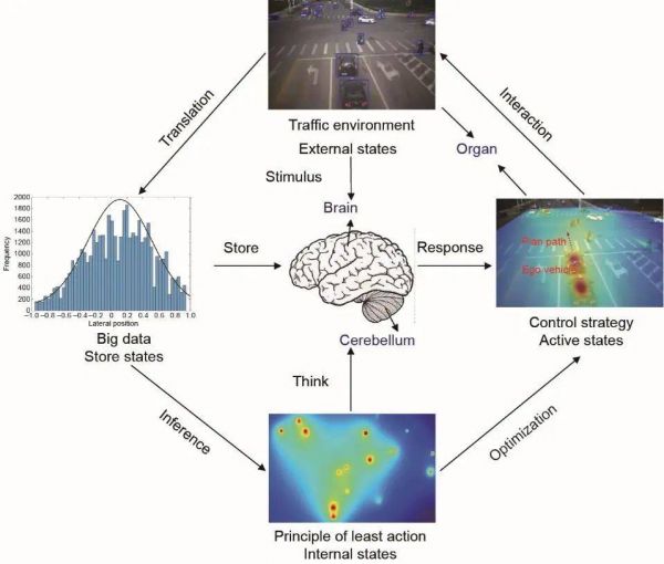 而现有的分层框架和端到端框架所对应的基于场景驱动的研发思路是一种“反馈传输”结构,而自动驾驶大脑对各部分结构不仅仅是单独的刺激-反应双向反馈,而是包含意向扩散的复杂结构网络。如图2所示,在自动驾驶“大脑-小脑-器官”协调平衡框架中,通过感知器官感知外界环境来刺激大脑,同时转录为历史大数据储存到大脑中进行记忆。而小脑基于最小作用量原理,通过调用内部状态来完成思考与协调的功能,最后大脑和小脑一起输出激活状态,通过手脚控制器官完成控制过程。