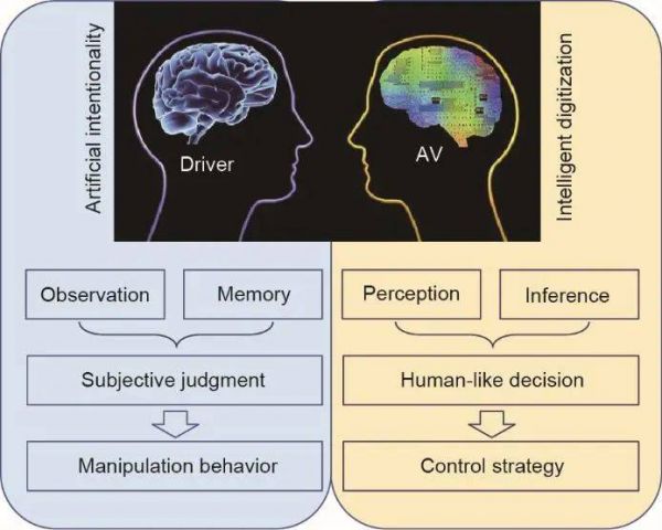 图3. 驾驶人和自动驾驶汽车之间的对应关系。自动驾驶汽车需要具备驾驶人的一些基本技能,并对人类行为及其社会期望有内在理解。即一个驾驶人的意向性,对应一个自动驾驶汽车的智能数字化。