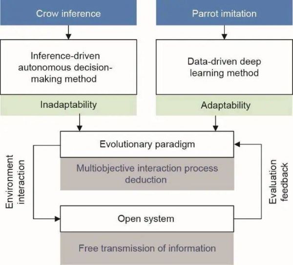 图4. “乌鸦推理+鹦鹉学舌”研究框架。“鹦鹉学舌”可以通过数据驱动的深度学习方法实现适应性,而“乌鸦推理”则体现对交通环境的不适应。通过两者结合,自动驾驶汽车可随环境的变化而实现交互和进化。