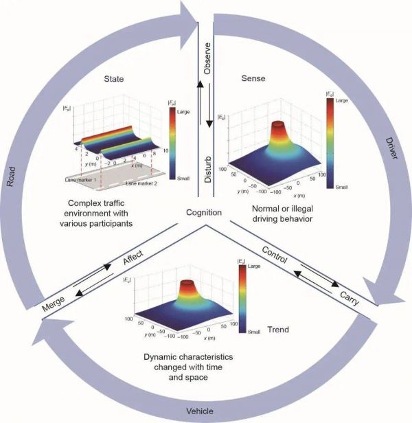 假设态势感知是状态-趋势-感觉-认知的统一输入。统一的安全场思路能够有效解决复杂环境下的综合态势感知和风险评估,实现时间和空间之间多域融合的多维尺度下的统一视角评估功能。智能车辆行驶过程将受到人-车-路三方面中多种因素的综合影响。由于道路交通复杂,路况多变;驾驶人员性格各异,行为不定;车辆系统复杂,性能耦合,使得行驶过程存在潜在风险,其安全态势具有时变、复杂和耦合的特性。
