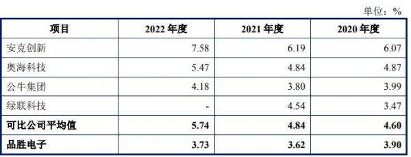从研发投入来看,报告期内,公司研发费用分别为4451.57万元、4803.63万元与4957.27万元,研发费用率分别为3.90%、3.62%与3.73%。同期品胜电子可比公司研发费用率的平均值分别为4.60%、4.84%与5.74%。
