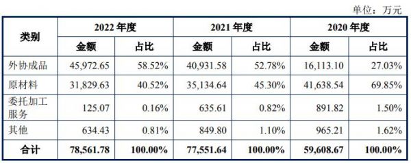 对于公司研发费用率较低,品胜电子在招股书表示:主要因为公司整体业务处于转型成长期,各个部门对资金需求较高,导致公司投入研发方面费用有限。3C电子行业本身不是技术门槛很高的行业,行业内大部分公司产品都是外购成品。2022年,公司对外采购金额为7.86亿元,外协成品采购金额高达4.60亿元,占比为58.52%。