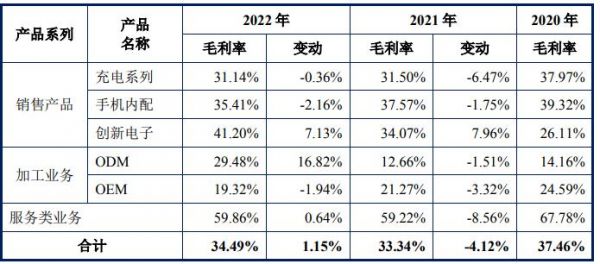 2020年创新电子业务毛利率为26.11%,到2022年大幅攀升至41.20%,成为品胜电子综合毛利率维持稳定的重要因素。