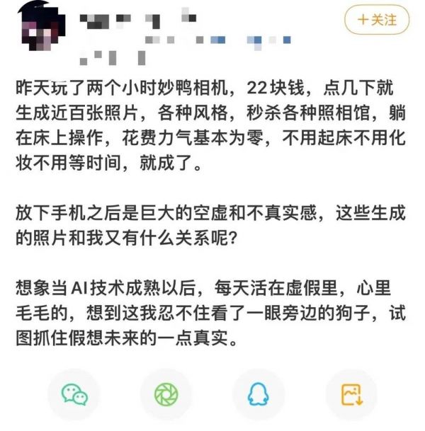 近来社交平台上出现许多和“注意力涣散自救”相关的帖子,长期与碎片信息相伴的人们已在不知不觉间退化了现实中的专注力。而AI写真把生成的形象冠以“数字分身”之名,也在暗示为一个更难以挣脱的虚拟时代搭桥铺路。