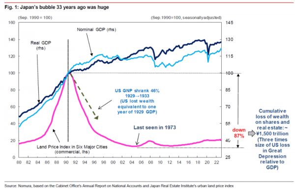 到2005年,日本六个主要城市的物业平均价格下跌了87%。在这个过程中,国家损失的财富总额达到了1,500万亿日元,约相当于1989年国内生产总值的三倍。