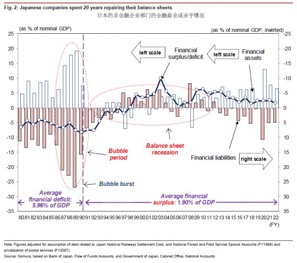 1999年以前,日本非金融企业部门都处于金融赤字状态,而资产负债表衰退从1990年左右就开始了。