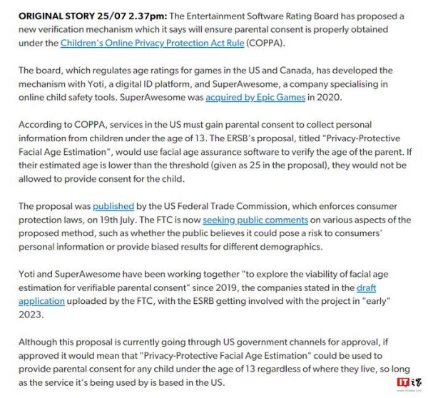 在美国和加拿大,游戏和服务必须获得家长同意才能收集 13 岁以下儿童的个人信息。这项新技术被 ERSB 称为“隐私保护面部年龄测算”,通过扫描父母的面部并估计其年龄。提案将父母的年龄界限设置为 25 岁,如果识别出的年龄低于该值,将不允许为孩子提供同意书。