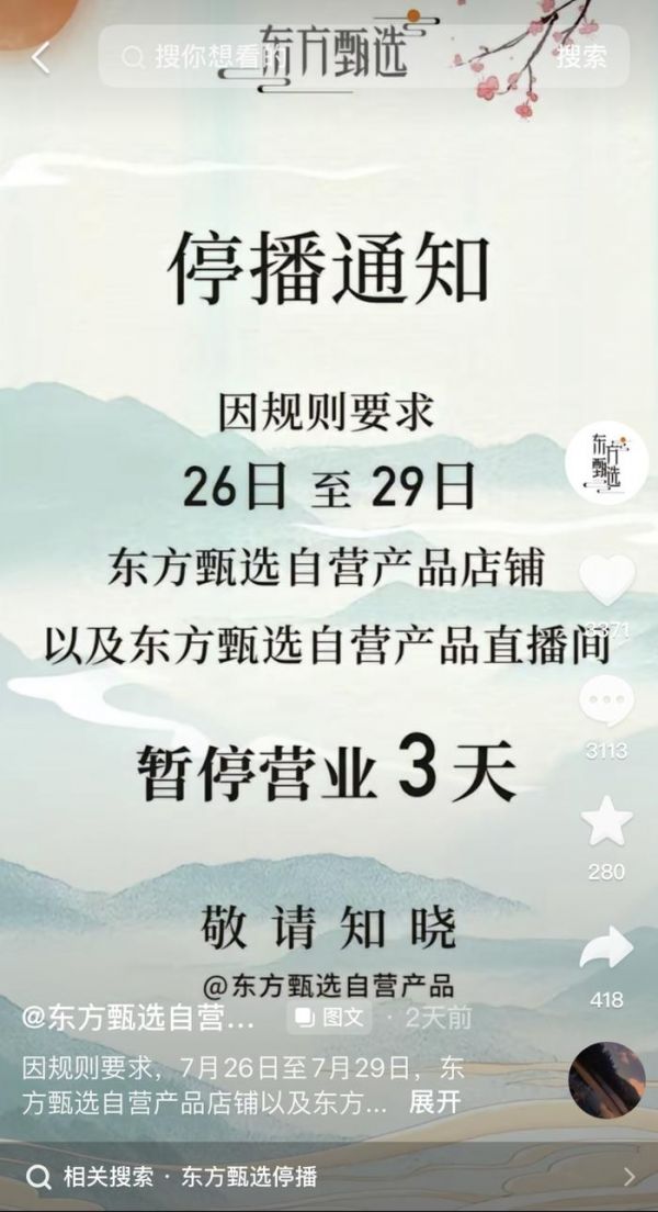 7月26日,“东方甄选自营产品”抖音号毫无预兆发布公告:因规则要求,26日至29日,东方甄选自营产品店铺以及东方甄选自营直播间暂停营业3天。