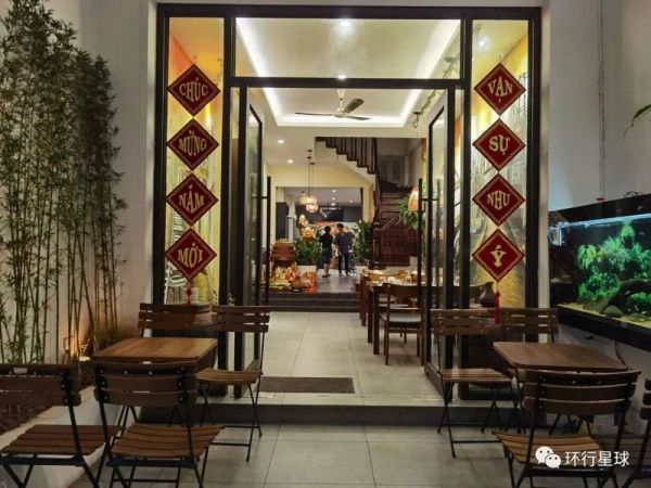 饭店门口庆祝新年的对联,左联是“新年快乐”,右联是“万事如意”。右联可以和汉字一一对应拼读出来,而左联则是汉越夹杂,“chuc”是汉字“祝”,“mung”、“nam”、“moi”则对应着越南语的“快乐”、“年”和“新”。