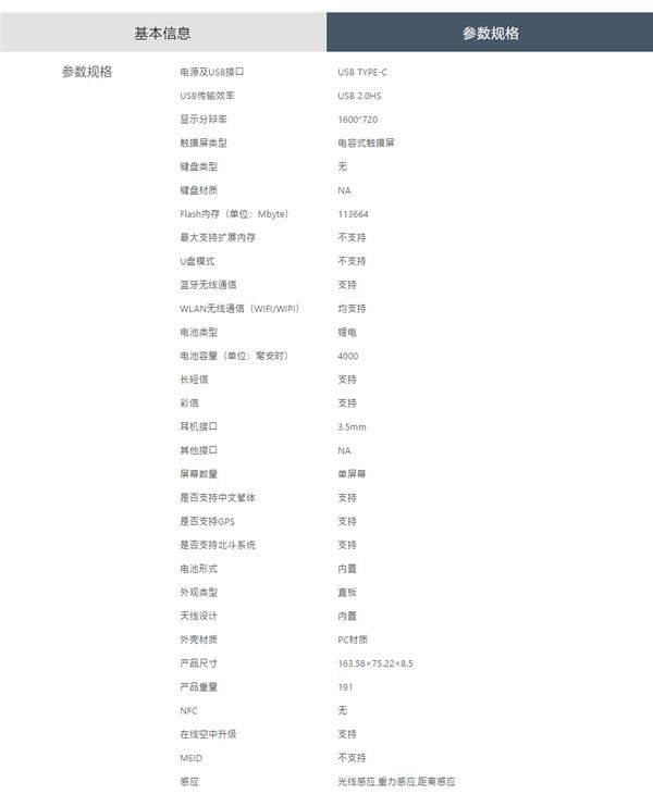 其他方面,机身内置4000mAh电池,支持5W充电,整体厚8.5mm,重191g,提供3.5mm耳机孔、USB Type-C接口。