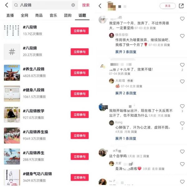 直到今年夏天,八段锦彻底火了,小红书、抖音很多用户突然成为八段锦的自来水,他们晒出练习八段锦的前后对比图,细数坚持过程中身体的种种变化,热情地推广此项运动,谢萌才开始将此事放在心上。