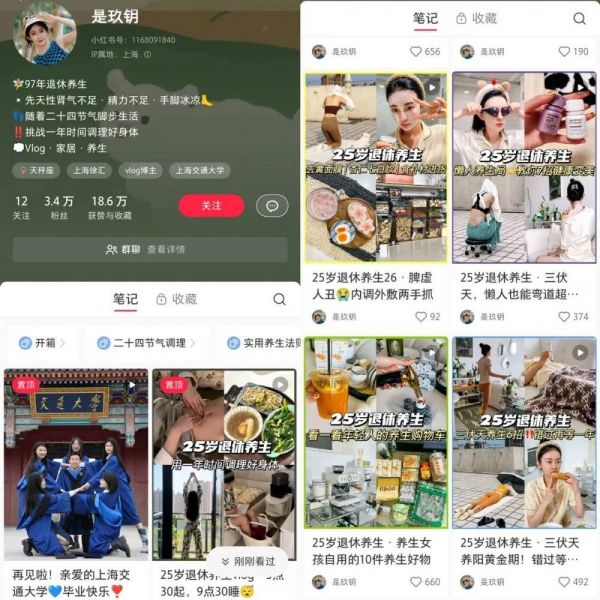 据新红数据显示,2023年上半年带有“养生”关键词的内容新增笔记超过93万,互动热度超过1.23亿。刺猬公社联系到今年4月开始经营小红书的养生博主@是玖钥,玖钥于4月30日发布第一篇视频“25岁退休养生vlog”,半年来涨粉超过3万。对此,玖钥表示:“我也很意外,没想到开始做自媒体,第一篇就爆了。”
