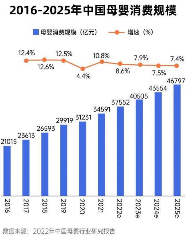 中国母婴市场迎来持续增长,2021年中国母婴消费规模达34591亿元,艾瑞预计,未来中国母婴市场仍保持稳定增长趋势,到2025年中国母婴市场规模将达到46797亿元。